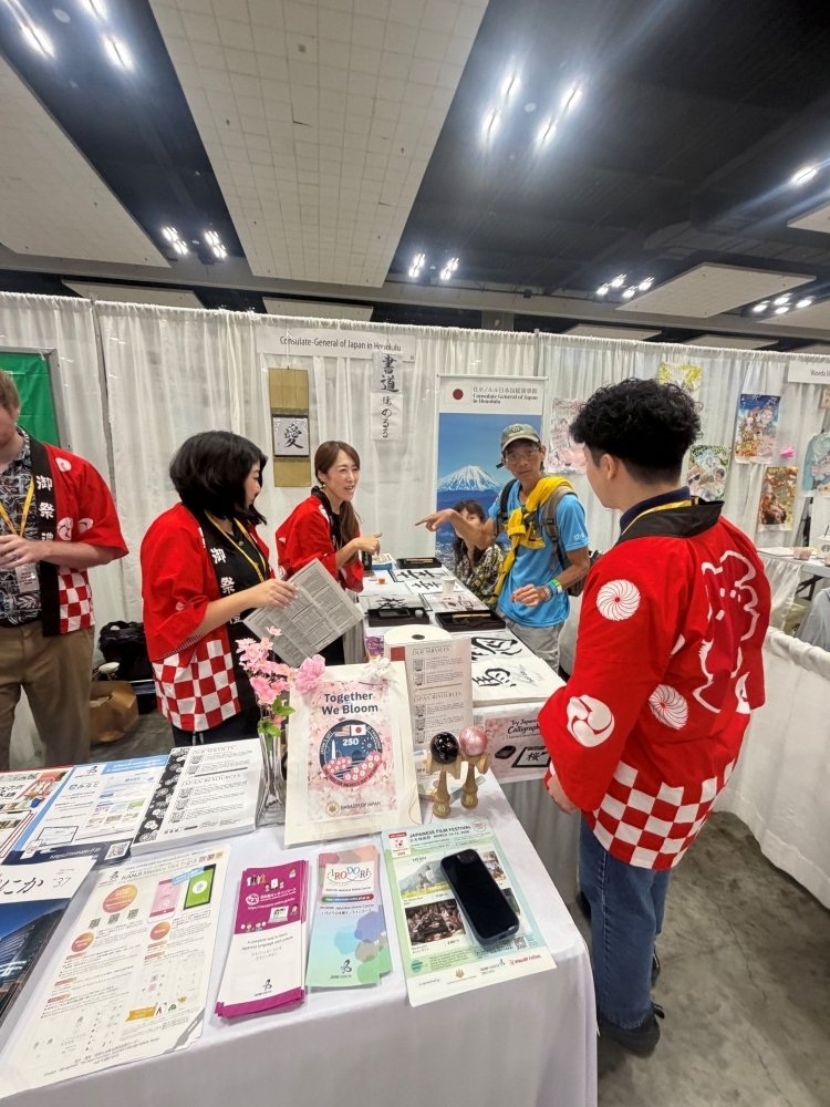 The Consulate's booth at the Hawaii Convention Center showcased Japanese culture, travel to Japan, and the activities of the Consulate. With the cooperation of the Kaede Calligraphy School Hawaii, we hosted a calligraphy experience corner, allowing many visitors to try their hand at traditional Japanese calligraphy. In addition, we provided panel displays and distributed informational materials on Japan, offering visitors of all ages an opportunity to deepen their understanding and appreciation of Japan.