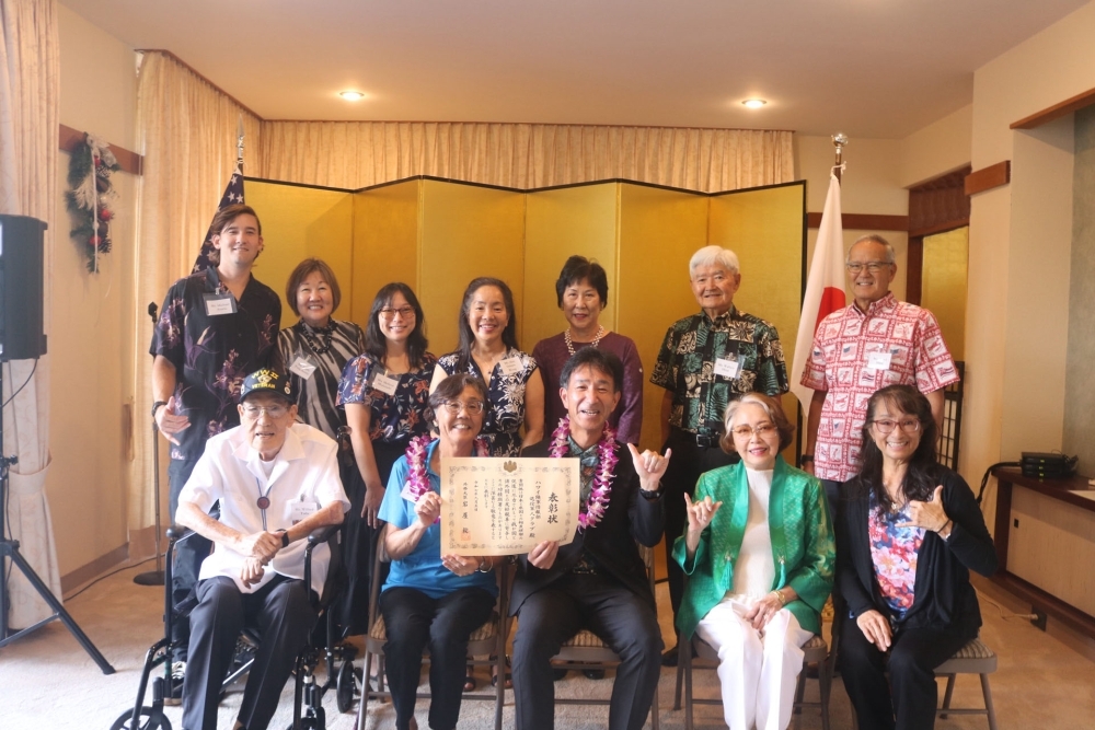 伝達式では、長徳総領事から、各団体が日系退役軍人の歴史継承や日米交流の促進に尽力してきたことへの深い謝意を述べました。続いて表彰状の奉読・授与が行われ、各団体を代表して答辞が述べられました。ハヤシ会長は、外務大臣表彰への感謝とともに、退役軍人支援や日米友好に向けた取り組みを振り返り、関係者への謝意を示しました。オケムラ会長は、ハワイ州並びに米国本土の日系人の歴史に言及し、今後次世代への歴史の継承のためにさらに尽力していく上で今回の表彰は非常に励みになると述べられました。キクカワ会長は、家族の戦時体験を通して陸軍情報部の役割を振り返り、同部隊が戦争中に果たした重要な役割を強調するとともに、表彰を受けたことへの感謝の意を表しました。